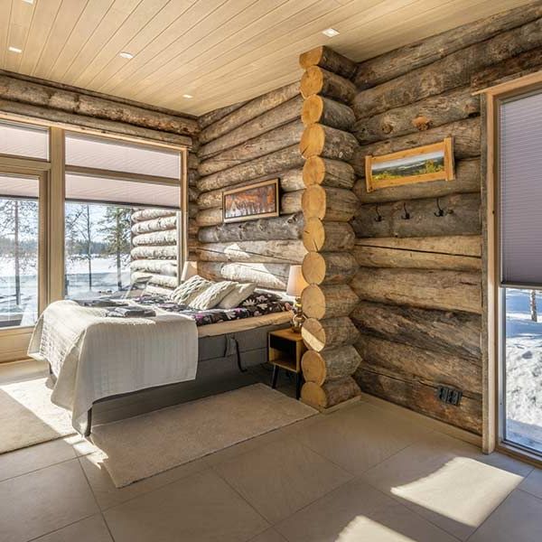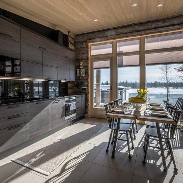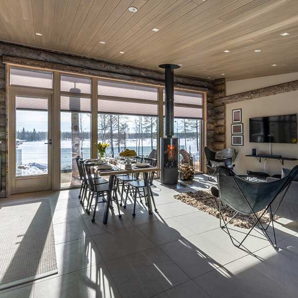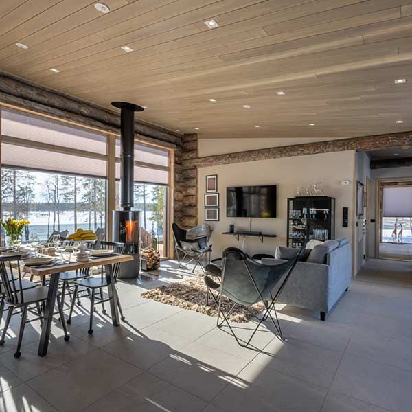 Bright and modern Villa Kuura located on the shore of Lake Vuosselijärvi invites you to spend your holiday near nature all year round. This fully equipped villa is designed to meet the highest standards, and has a gorgeous view over the lake from every single window. The villa has a 58 m2 terrace with a view to the lake. There is a partly glazed building on the beach, with a 8 m2 wooden sauna (only for a summer use 1.6-30.9), and also a 20 m2 glazed barbeque hut with a fireplace.
