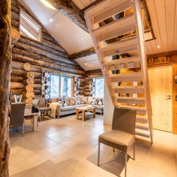 This log villa Rukan Tuike is located in the east-Ruka in Vuosseli, right next to the mountain Ruka. The villa is one half of a semi detached house, where both villas are separate buildings, joint together with a shared garage.