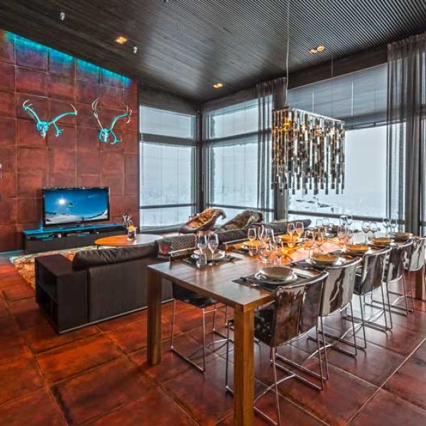 - FIRE – 2nd, Main floor with panorama views at the heights close to 500m, where you can watch the sunrise/sunset over the treetops and lakes. An ultramodern Gaggenau kitchen opens up into the dining area and main living room. Master bedroom window provides view of Lapland in its all colors