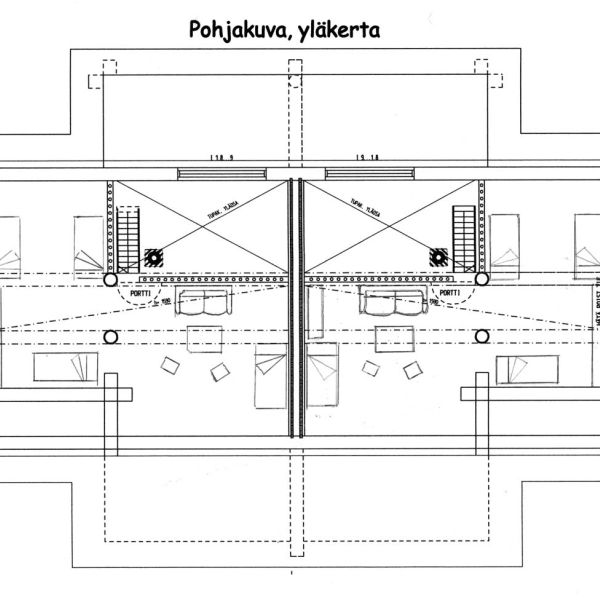 The downstairs master bedroom and the large upstairs space offer spacious accommodation for 6 people plus an extra bed (mattress) for 2 when required (30 €/each). There are comfortable living rooms in downstairs and in upstairs, a functional kitchen and dining area, 2 bathrooms, and an elegant sauna department with 2 showers.