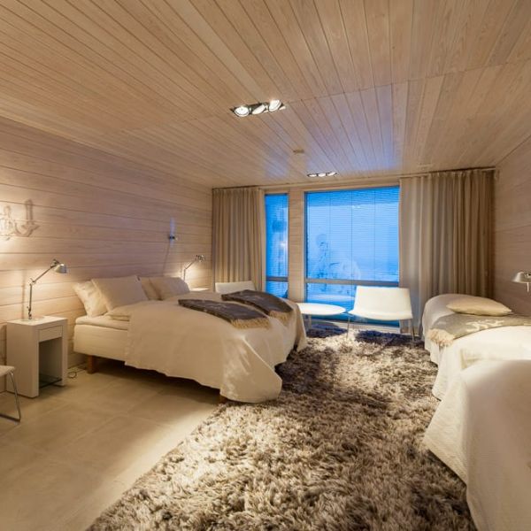 - LUMI: Ensimmäisen kerroksen makuuhuoneet tarjoavat uskomattomat maisemat yli kinosten ja tykkylumipuiden tai syksyisen ruskan värittämän maiseman. Erillinen oleskelutila varustettuna takalla ja taulutelevisiolla takaa riittävästi tilaa ja rauhaa kaikille. Päätyhuone on suunniteltu ajatellen etenkin lapsia, jotka voivat majoittua yhdessä isoon huoneeseen, jossa on riittävästi tilaa ja vuoteita useammallekin hengelle. Lumen ja luonnon värein koristellut lämpimät makuuhuoneet kutsuvat sinua Lapin taikayöhön